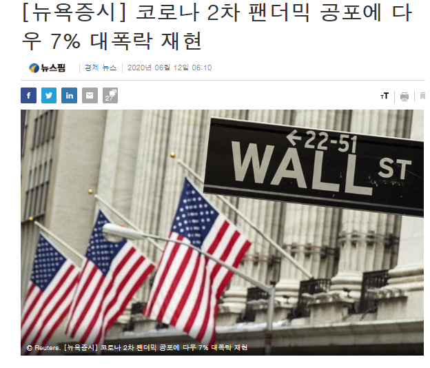 2차 팬더믹 공포로 인해 다우지수가 6월 11일 7% 폭락했다.