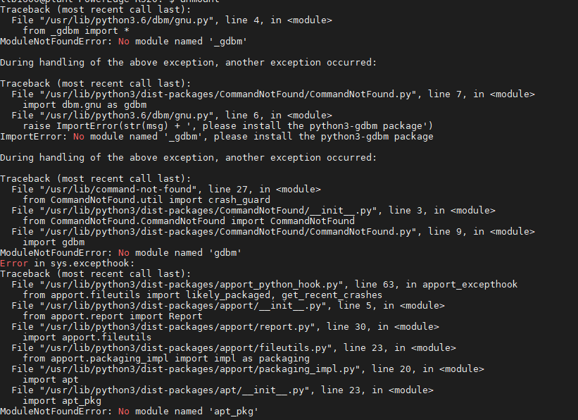 unmount하고 다시 마운트를 시도 하려했지만, 다음과같은 gdbm에러들이 발생했다.