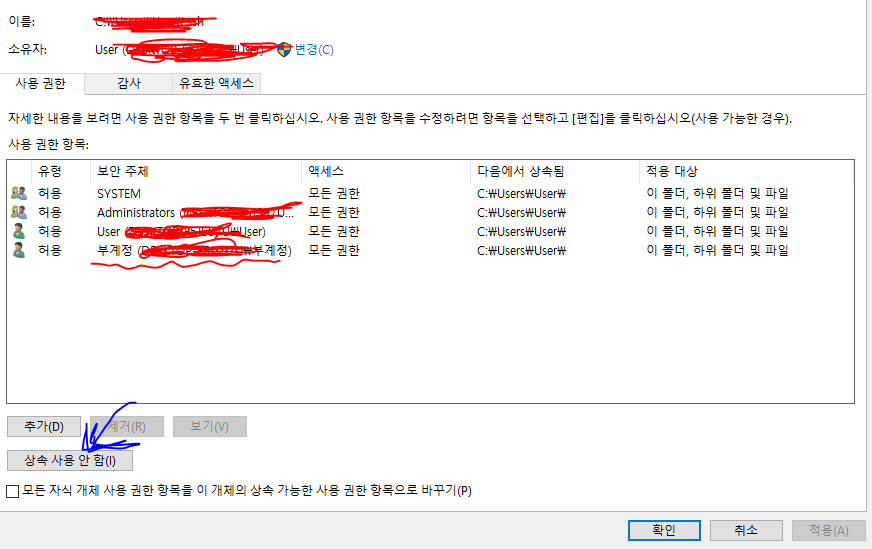 그냥 제거 하려고 하면 안된다. 고급을 클릭해 다음 과같이 상속 사용안함을 진행해준다.