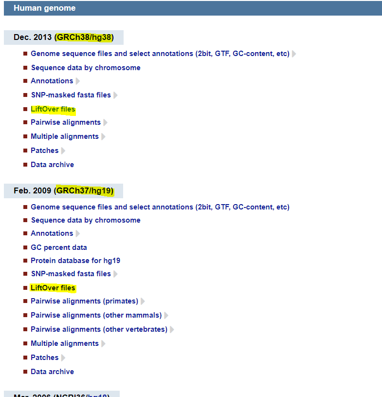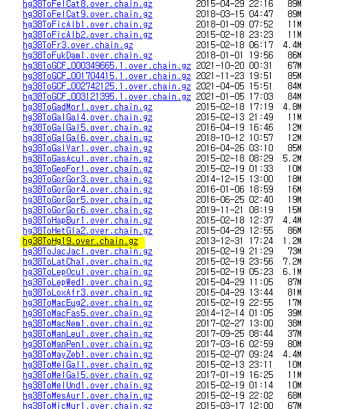 hg38tohg19가 하고 싶으면 hg38의 LiftOver files로 들어가면 다음과같이 주루룩 나온다.