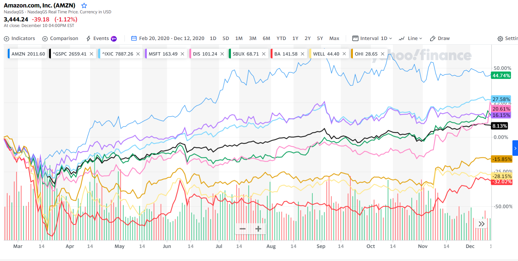 포스팅 현재 2020년 12월 5일 코로나 이후의 관심있는 종목들의 변화를 살펴보고자 한다. 검정색은 S&P500 하늘색은 나스닥 지수이다. 흐름관찰에 용이를 위해 2월 20일을 전고점이라 칭한다.( 실제