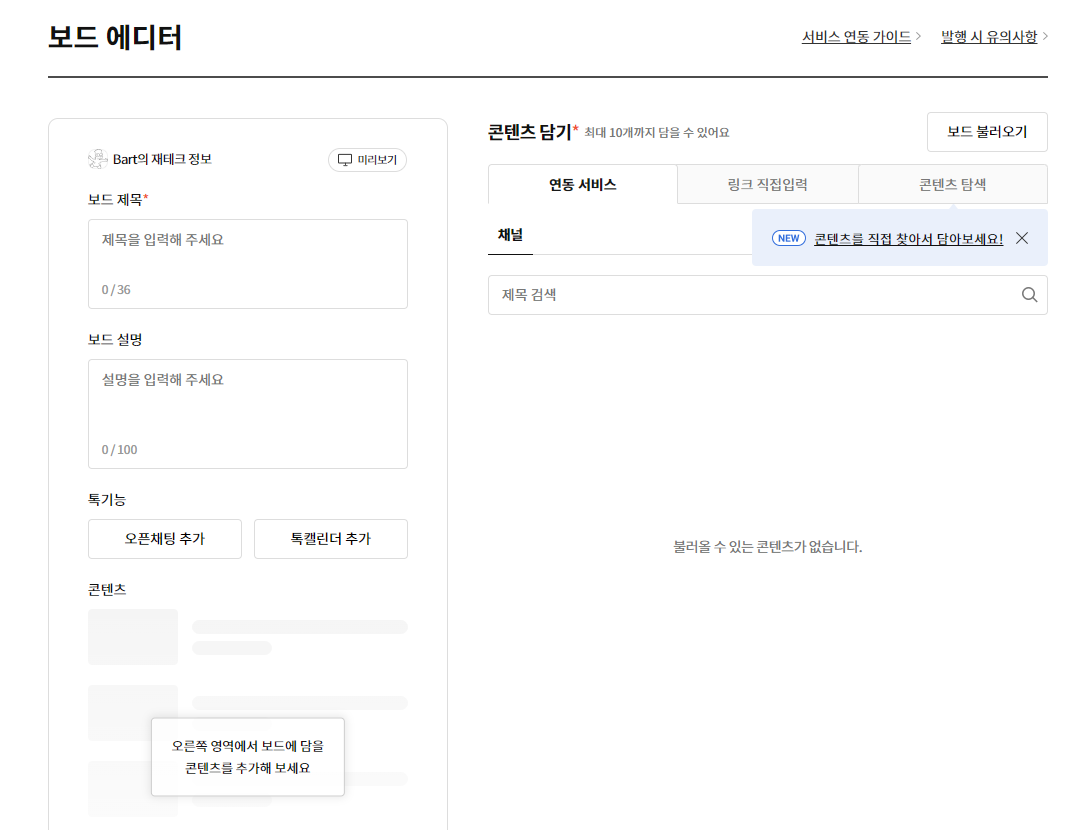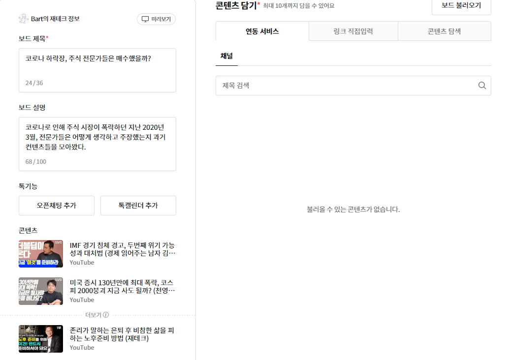 위의 보드 만들기 페이지에서 보드제목, 보드 설명을 적어주고 오른쪽 콘텐츠 담기에서 큐레이팅할 콘텐츠들을 추가하면 된다.